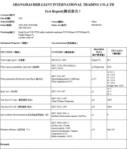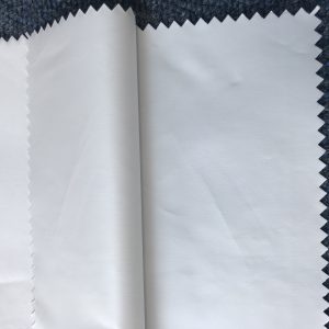 | завършек | Finish:Dyed+W/R+PTFE milky breathable membrane W/P10000mm MVP5000g/m2/D; Weight:92gsm±5%; Ширина на ножа: 58 " |